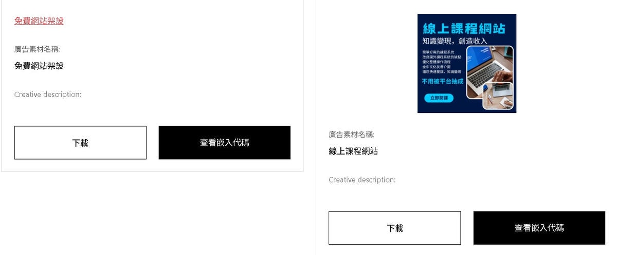 左方點選 [推廣素材],點選[查看嵌入代碼],將代碼複製起來