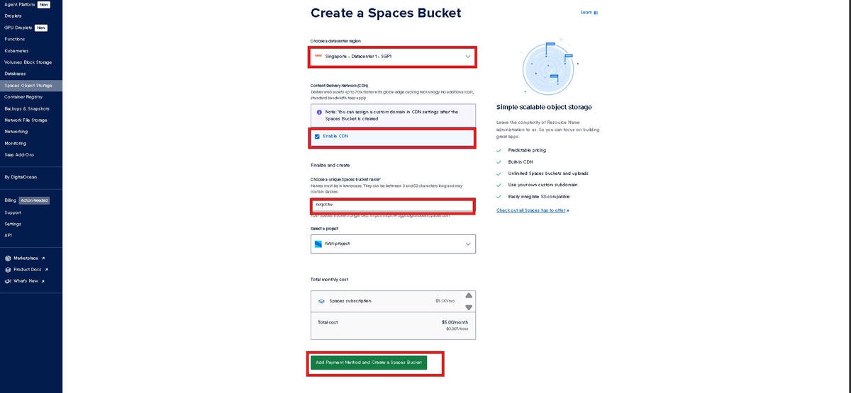 點選下方綠色按鈕,新增付款方式和Create a Space Bucket