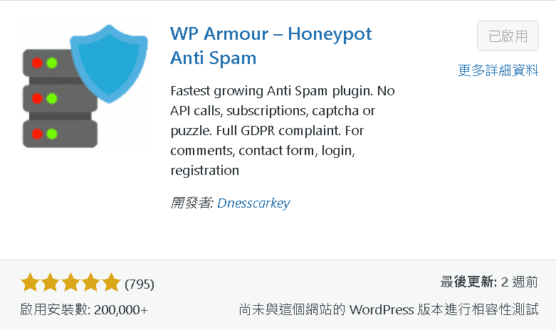 付費擴充功能:提供付費版本 (WP Armour Extended),支援更多防垃圾訊息功能。